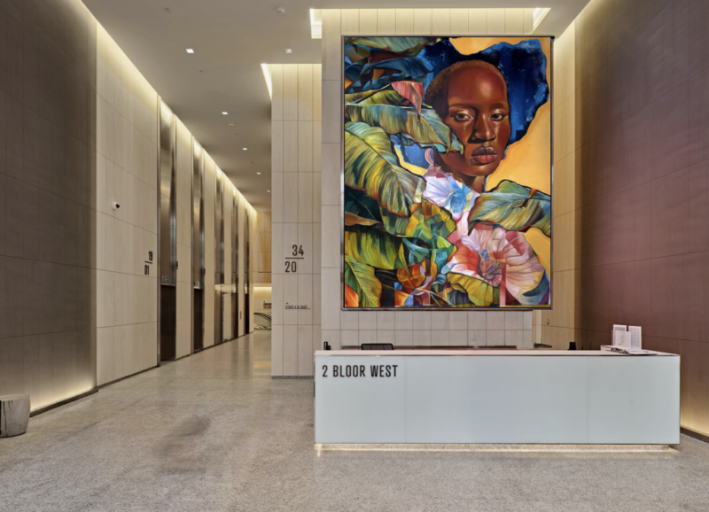 Highness Global curates a weekly art exhibition in the lobby at 2 Bloor Street West for Kingsett Capital. The program presents a rotating selection of contemporary Canadian artists, bringing current art and cultural dialogue into the building and transforming the lobby into an active, engaging public space.