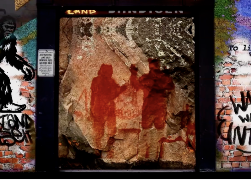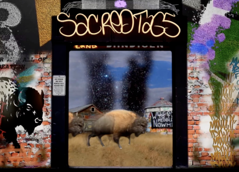 Sacred Tags is an interactive projection that merges Anishinaabe language, graffiti, and land-based imagery within an urban landscape. Inspired by traditional rock art and street culture, the work invites audiences to activate hidden words and symbols through movement, foregrounding living Indigenous histories in Toronto’s cityscape.