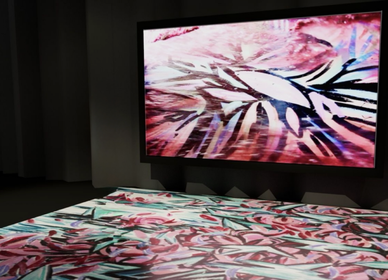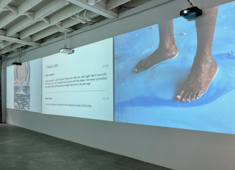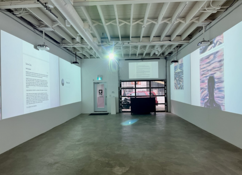 The launch exhibition of Triple Slash: /// featured 360-degree projections highlighting the work’s interactive structure. The mixed media project weaves painting, poetry, video, chat logs, emails, and legal documents into a cross-genre narrative tracing a queer artistic collaboration across continents, years, and digital space.