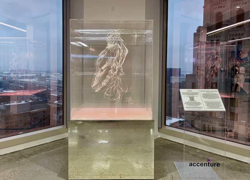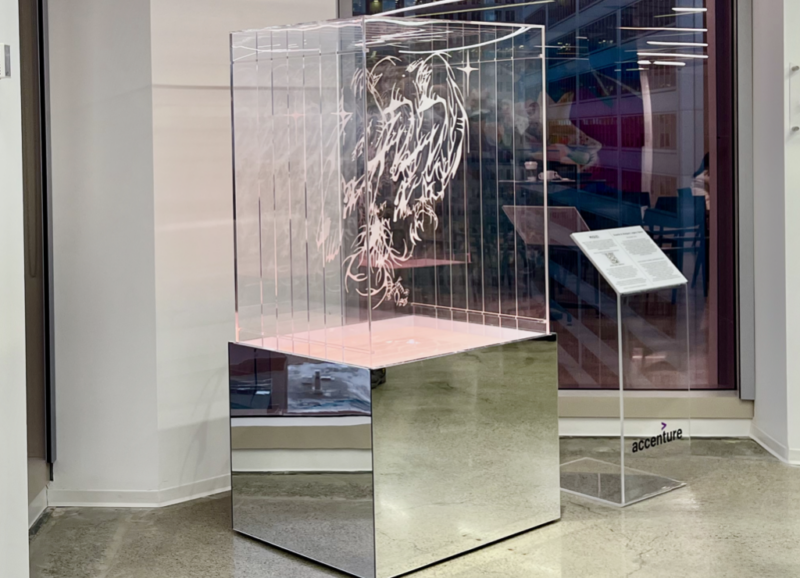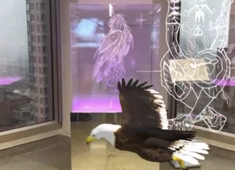 Migizi is a light-activated vitrine composed of multiple layers of etched acrylic on a mirrored platform. The work deconstructs and reconstitutes Johnston’s Migizi drawing through the framework of the Seven Grandfather Teaching of Love. The work is overlayed with an augmented reality installation by artist Quinn Hopkins, extending the work’s spatial and cultural dimensions through immersive engagement.