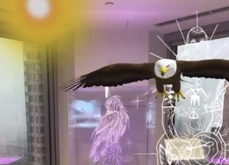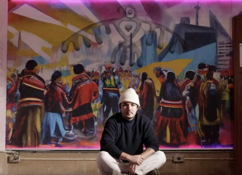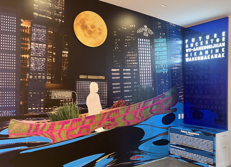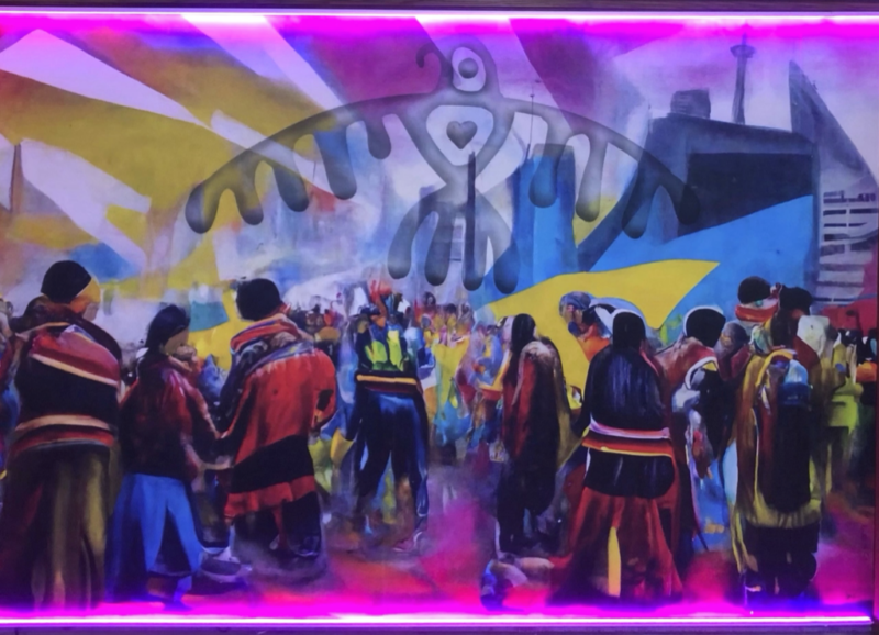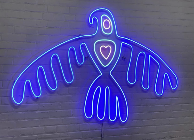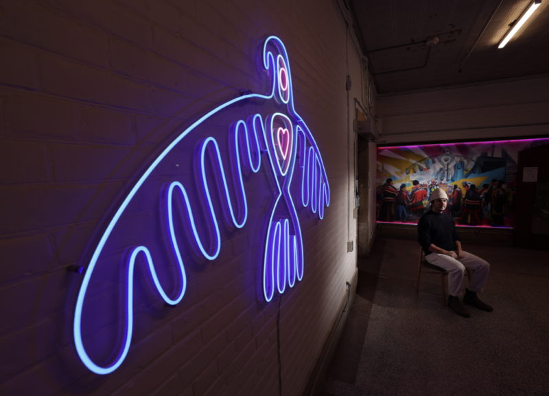 Intertribal is a mural and light sculpture depicting a celebratory powwow beneath an eagle (Migizi). Blending spiritual symbolism with contemporary aesthetics, the work centers inclusivity, love, and community. An augmented reality activation animates the eagle through viewers’ devices, extending the piece into a technological reflection of evolving Indigenous culture.