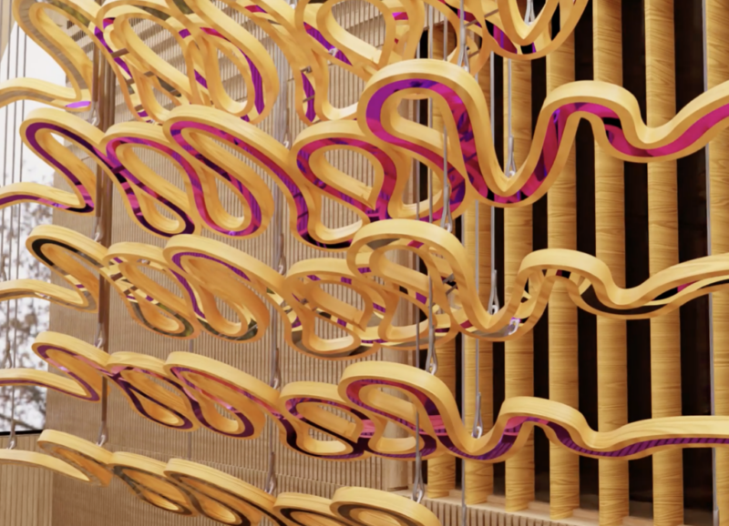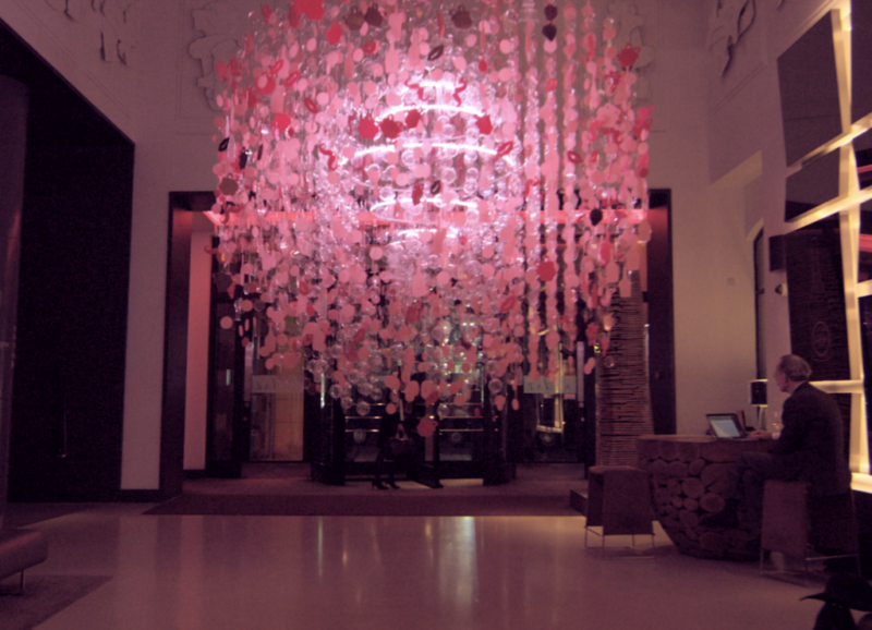 Bubble of Wonder is composed of thousands of bespoke, laser-cut acrylic ornaments precisely matched to the Pantone of Laurent-Perrier Cuvée Rosé. Activated by motion sensors, the responsive lighting shifts with the movement of guests, creating an atmosphere of subtle interaction and discovery within the hotel’s London setting.