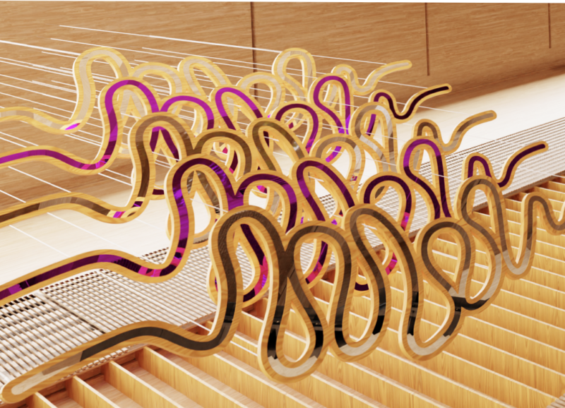 BAKETIGWEYAA is a suspended sculpture composed of five CNC-cut wooden frames with mirrored acrylic inlays, held by steel cables. Inspired by the Two Row Wampum Belt Treaty (Kaswentha), river systems, and tributary formations, the work reflects on peace, mutual respect, and the evolving nature of Indigenous and settler agreements within contemporary urban contexts.