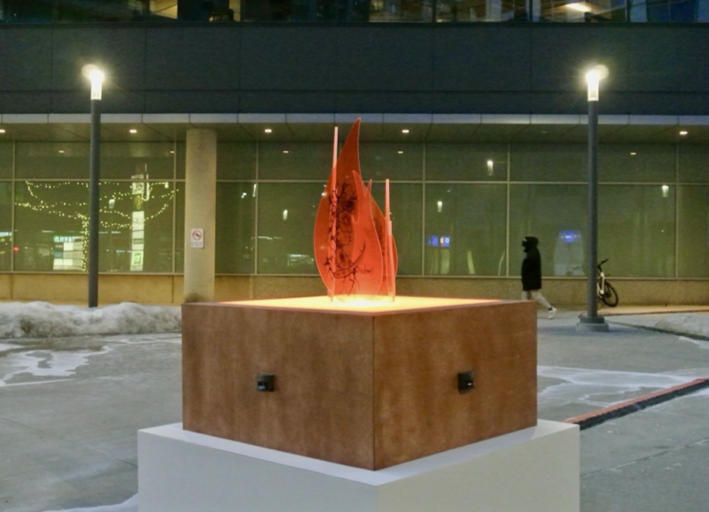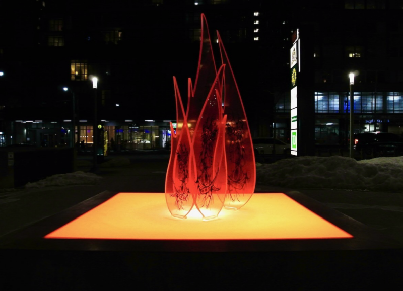 Fireside Storytelling is an experiential public sculpture with extended reality activation by artist Quinn Hopkins. Centered on Johnston’s drawing of a grandfather sharing teachings, the work draws from the Anishinaabe winter storytelling tradition. It invites viewers to gather as if around a fire, emphasising intergenerational connection and cultural continuity.