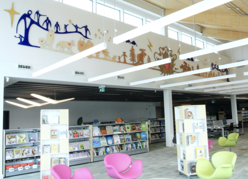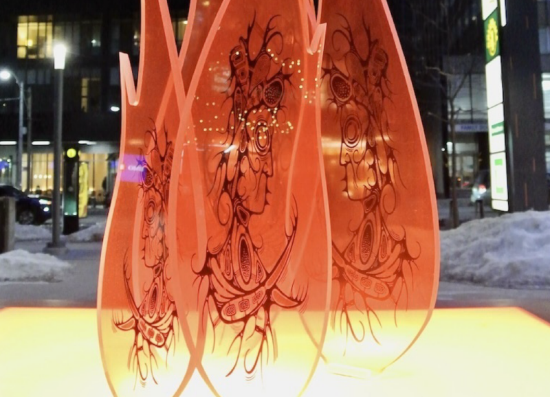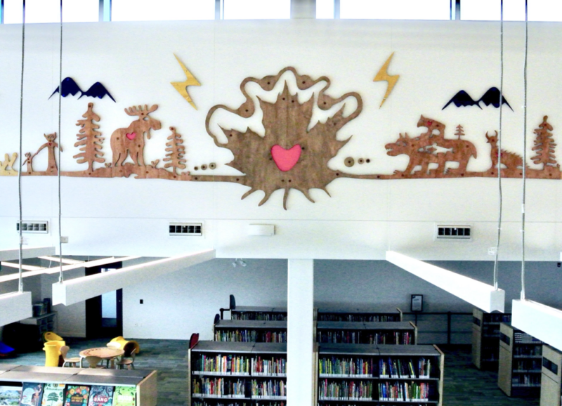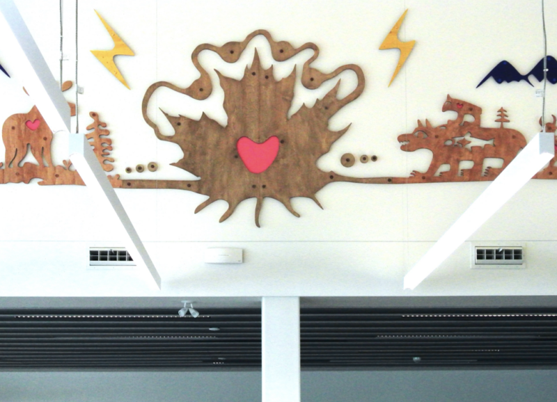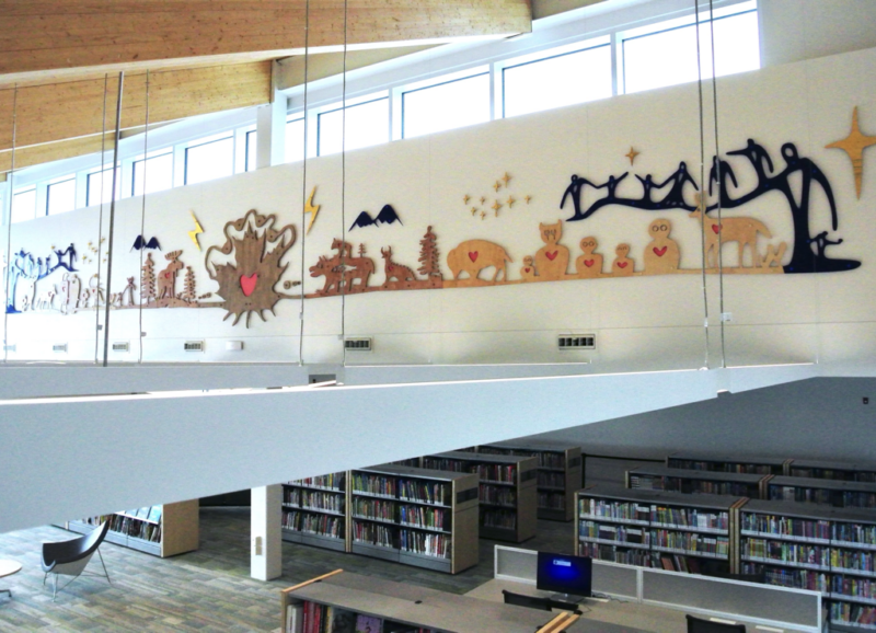 Wintertime Stories is a 16-metre-long wall sculpture composed of CNC-cut wood and laser-cut acrylic. Drawing on Indigenous storytelling and woodland animal teachings, it reflects on connection, stewardship, and environmental responsibility through symbolic figures of love, celebration, courage, and respect.
