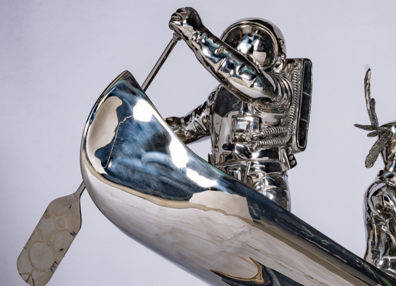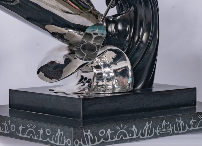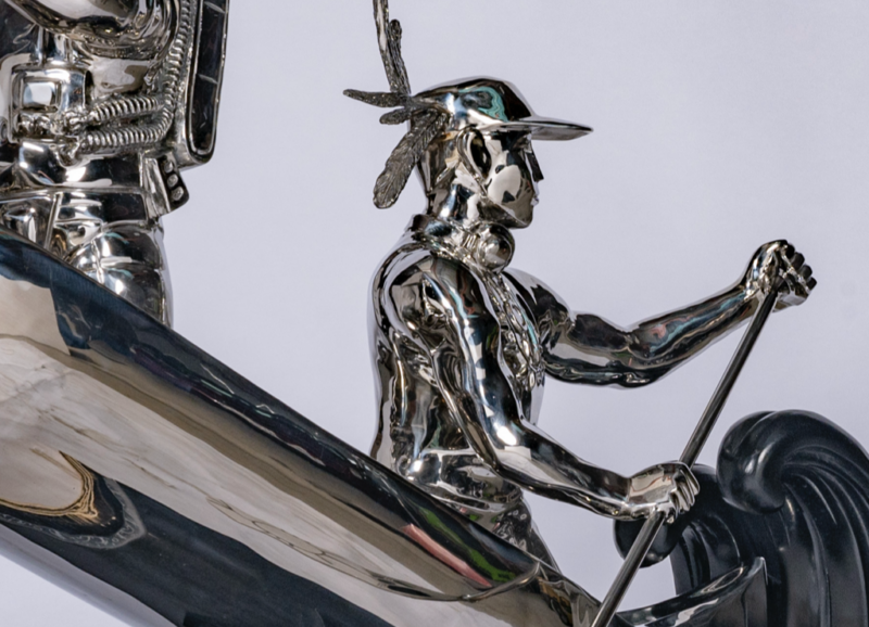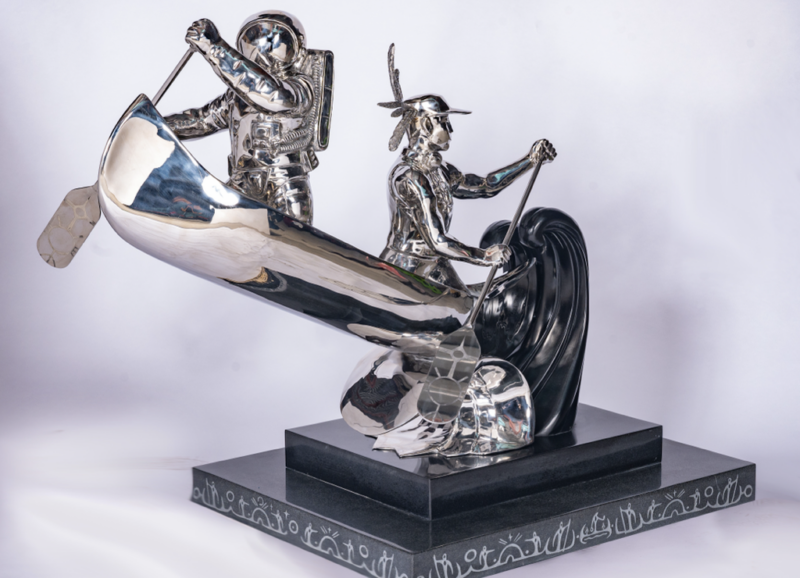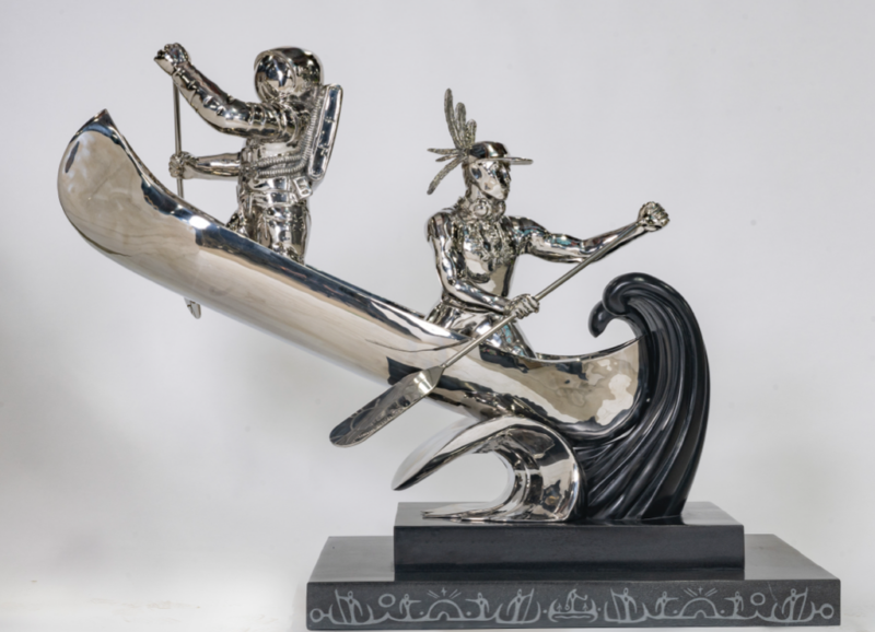 The Travellers is a sculpture made of chrome and stone exploring Indigenous and settler collaboration through contrasting materials and symbolic figures. Juxtaposing reflective and natural elements, the work considers coexistence and shared narratives. By blending tradition and modernity, it invites dialogue about mutual understanding and collective growth.