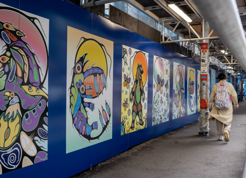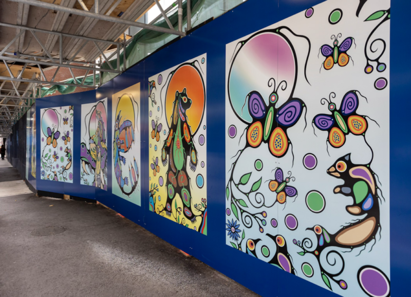 Interconnection is a large-scale hoarding installation at the intersection of Yonge and Bloor for Tridel’s 1 Bloor Street West. The mural situates the city within a broader ecological and spiritual framework, representing the relationship between humanity and creation and how human actions reverberate across sky, land, water, and subterranean realms.