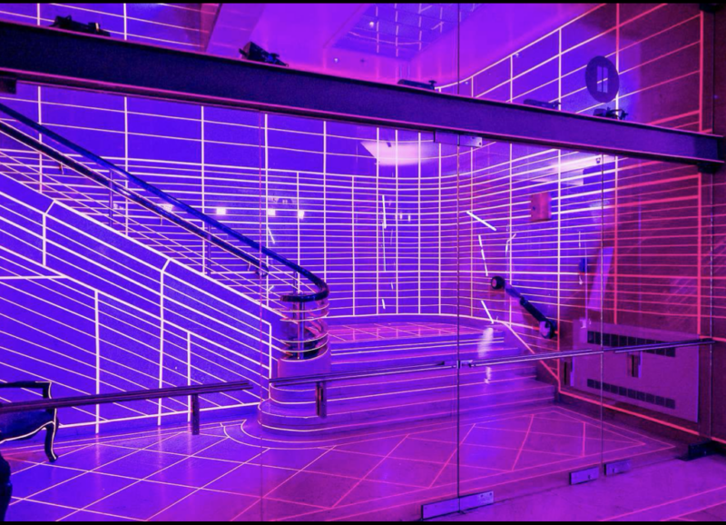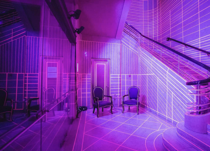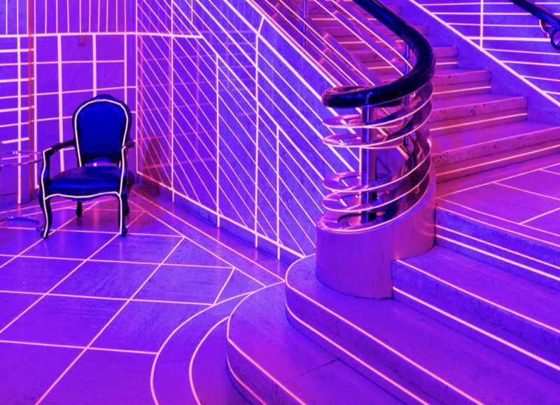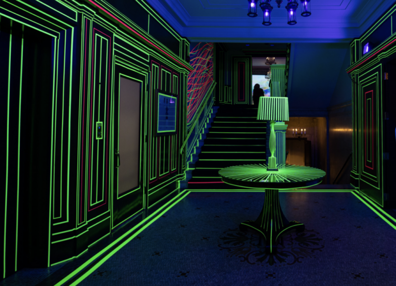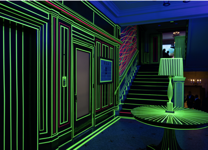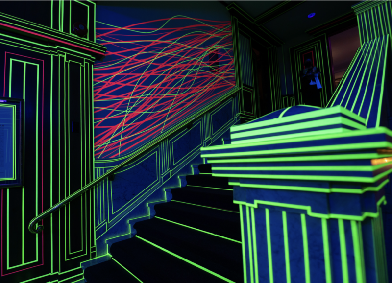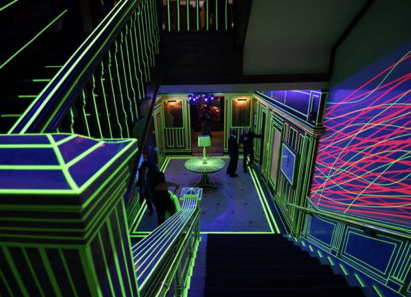 TRON is a black light and neon tape installation by Bruno Billio showcased at The National Club as part of its Future 150 celebrations. Transforming the lobby and ballroom into a contemporary art environment, the work recontextualized the Club’s historic interior through bold geometric interventions, bridging tradition and forward-looking vision.