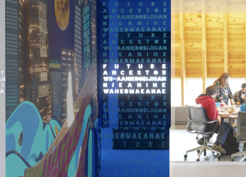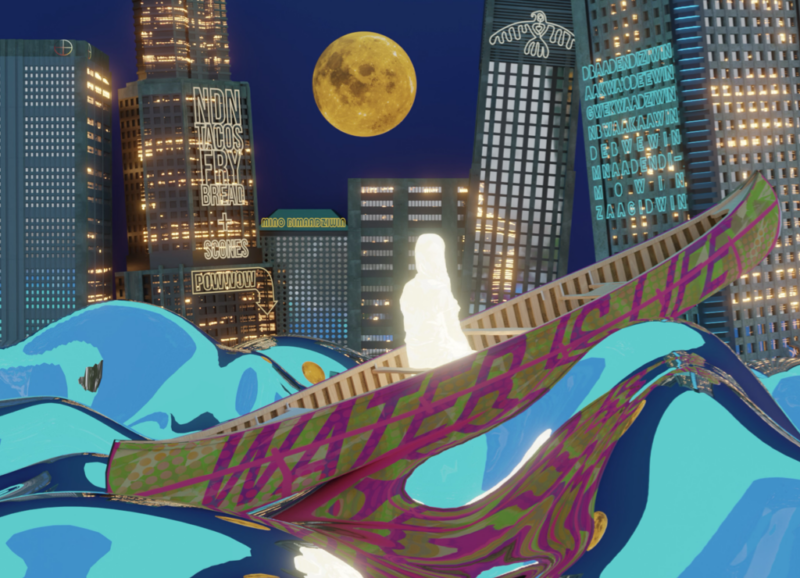 Future Ancestors is an installation located in the Odeyto Building, rooted in Indigenous Futurism and merging Anishinaabe water teachings with a contemporary cityscape. Reflecting on women’s relationship to water and ancestral continuity, the work bridges past and future through a hidden augmented reality activation.