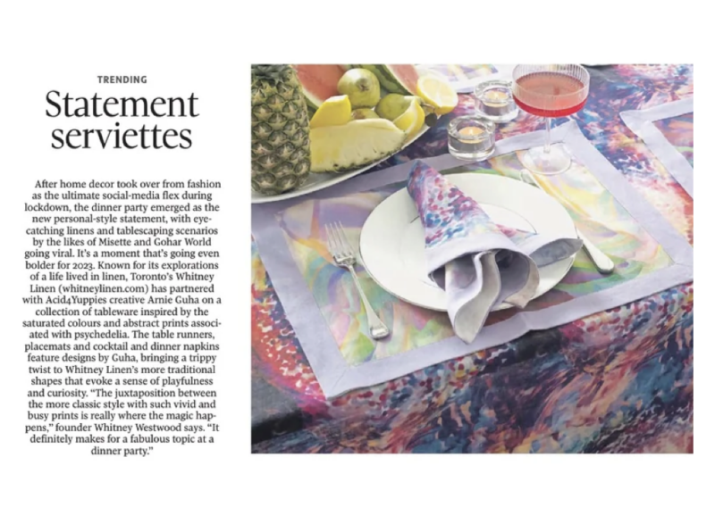 Whitney Linen x Acid4Yuppies Tableware Collection features psychedelic tableware including table runners, placemats, and napkins in saturated, abstract prints, the collection brings bold experimentation to classic linen forms, reimagining the contemporary dining aesthetic.