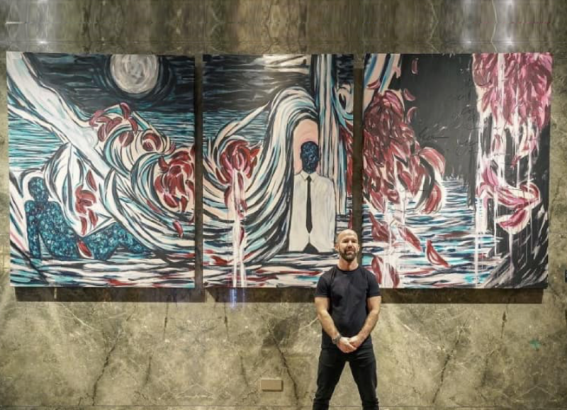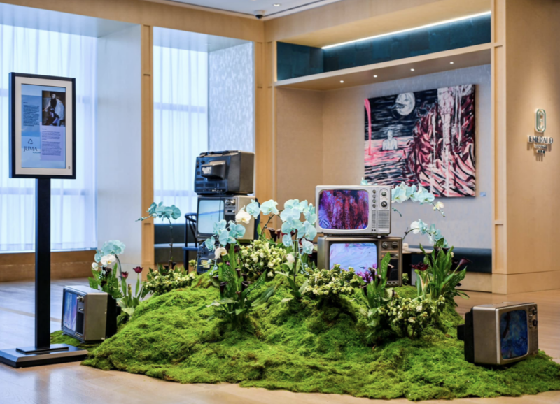 Floral Pour Exhibition was presented for the inauguration of the Nigel Nolan x JUMA hotel suite at the ground floor entrance and lobby of MGM Westbund Hotel (April–July 2024). Featuring large-scale paintings and experimental videos by Nolan, the exhibition expanded his Floral Pour series, exploring memory and emotion through fluid brushwork and water-infused compositions.