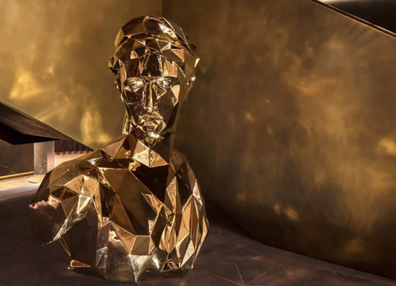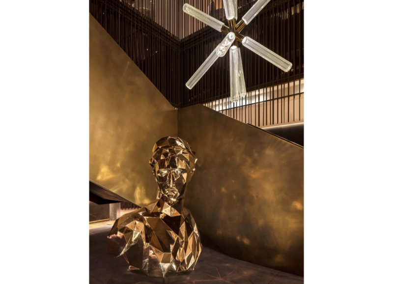 Gold Book Tower by Bruno Billio is a sculptural installation for the Four Seasons Hotel in Tribeca. Composed of gilded books stacked into Babel-like forms, the work reflects on knowledge as a shared human archive, inviting viewers to peer between the volumes and consider its layered, often hidden nature.